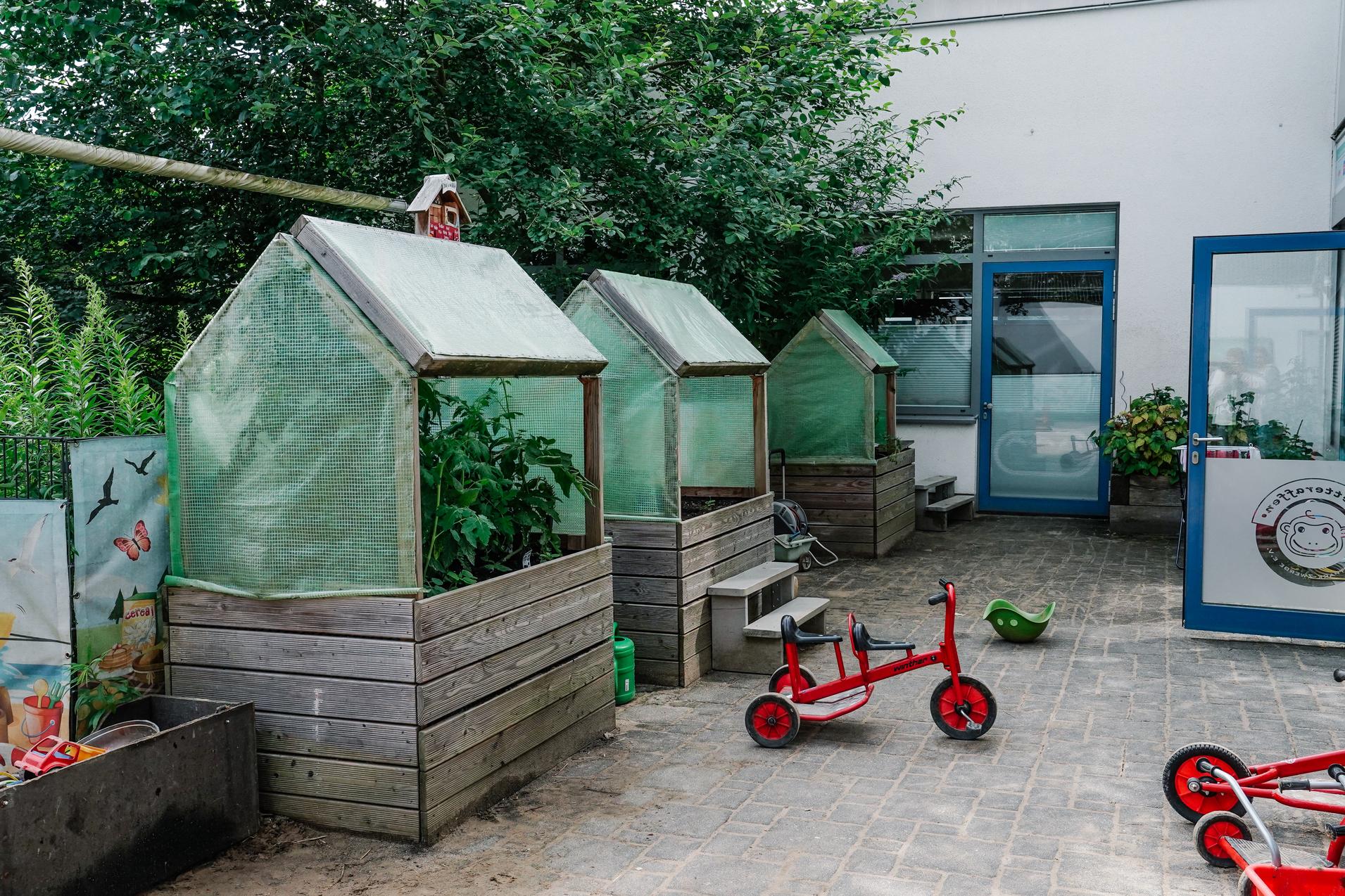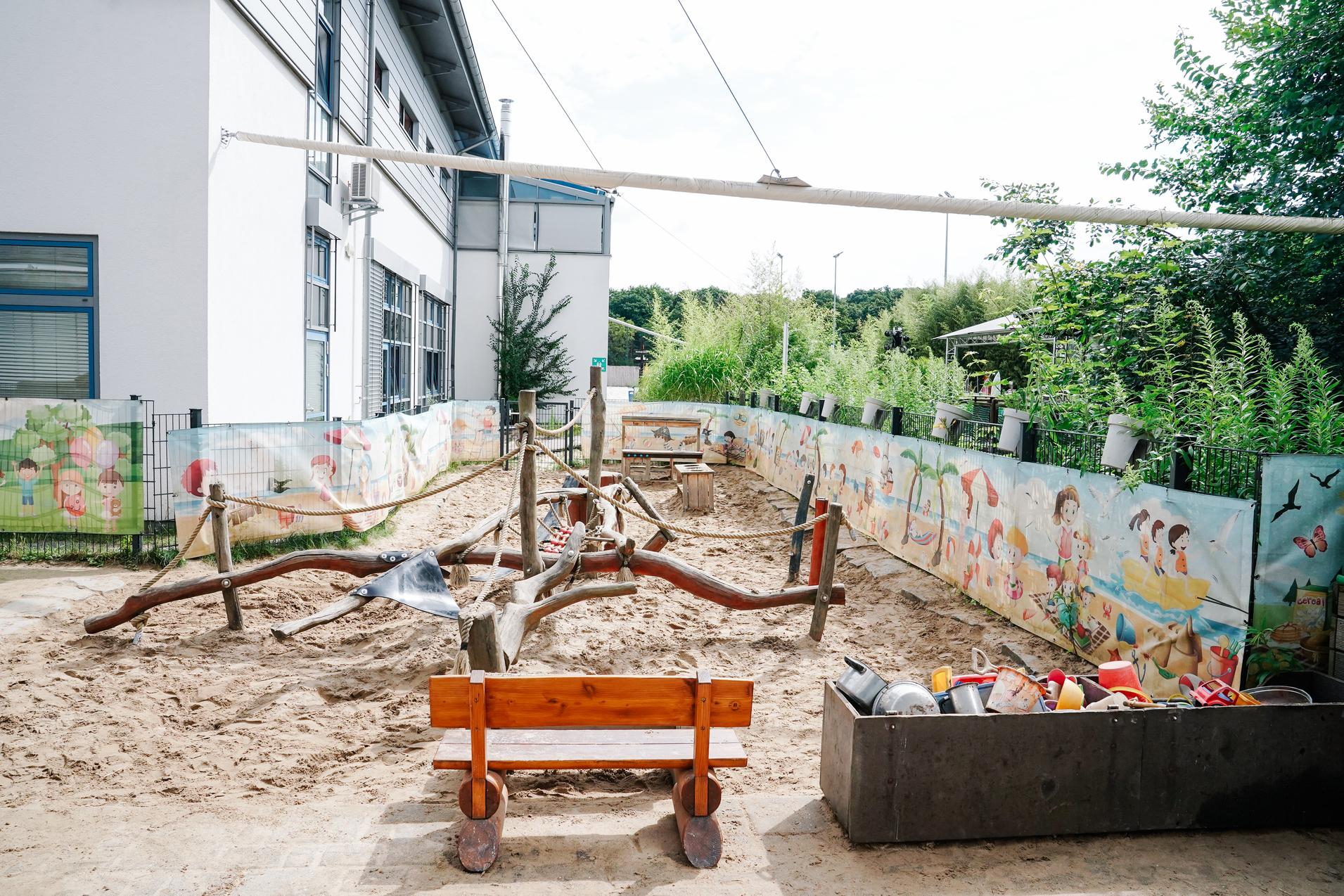 Jede unserer Gruppen hat einen direkten Zugang zu unserem kleinen Außengelände. Das Klettergerüst ist speziell auf die Bedürfnisse unserer U3-Kinder angepasst und jederzeit zugänglich. Ein Kunstrasenplatz, (eine Rennstrecke) sowie eine Spielküche bieten allerhand Möglichkeiten seiner Fantasie und dem Bewegungsdrang freien Lauf zu lassen.