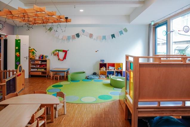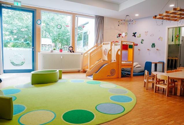 Die Raumgestaltung orientiert sich an den Bedürfnissen der Kinder und variiert dementsprechend. Dazu stehen den Kindern ein Frühstücks- und Esstisch, ein Kuschelbereich, ein Spielteppich, ein Malbereich, eine Puppenküche und eine Spielebene mit Versteckmöglichkeiten sowie eine Rutsche zur freien Verfügung.