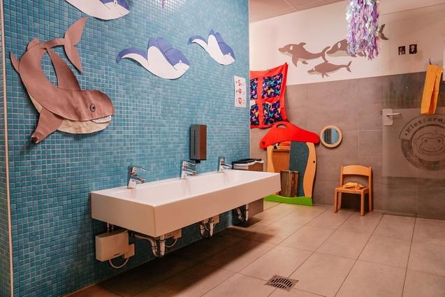 Die Größe des Gruppenraumes gibt den Kindern die Möglichkeit sich in einzelne Bereiche zurückzuziehen und andererseits die Freiheit sich auch in der Gruppe zu bewegen. Auch der Ruhebereich wird von den Kindern gerne zum Betrachten der Portfolioordner genutzt. Ein eigener Waschraum mit Wickelbereich ist selbstverständlich. Auch den Kletteraffen stehen der Flur und die Turnhalle zur Verfügung.