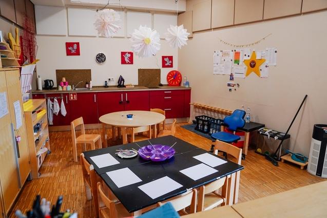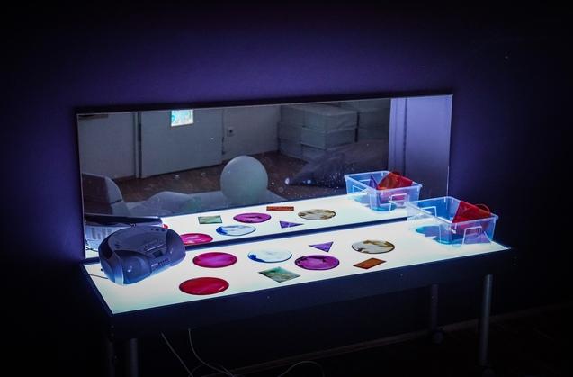 Außerdem befindet sich hier der Vorschulbereich für die zukünftigen Schulkinder und im Nebenraum ein großer Wahrnehmungsbereich. Dort werden gezielt Impulse auf den unterschiedlichen Ebenen gesetzt. So haben wir zum Beispiel viele Materialien, welche die taktile Wahrnehmung (z.B. Igelbälle) oder die visuelle Wahrnehmung (z.B. Lichteffekte) ansprechen.