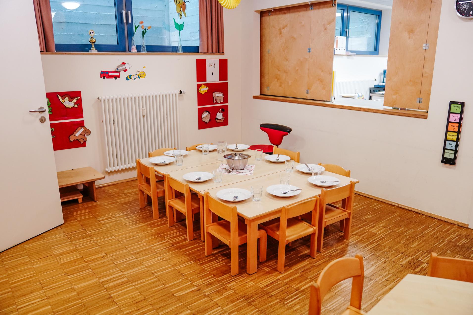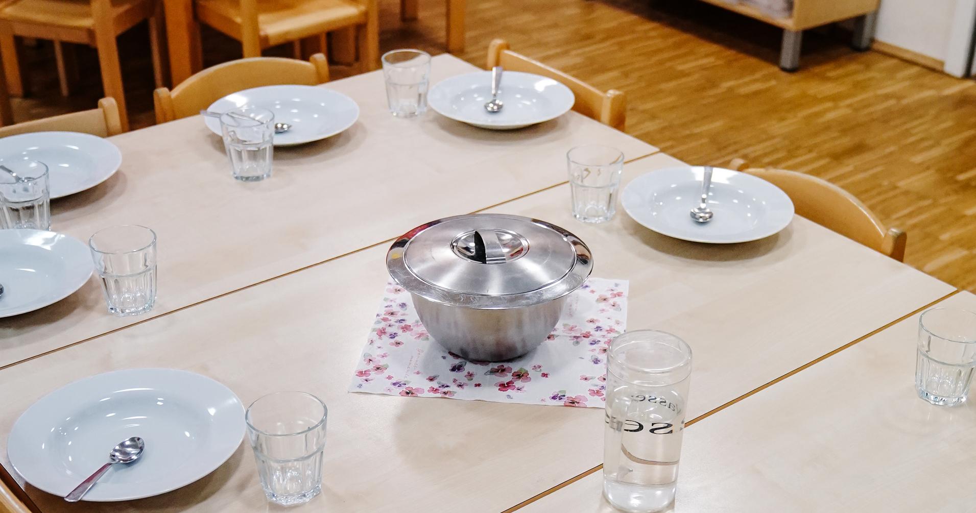 Unser Mittagessen bekommen wir jeden Tag frisch, kurz vor dem Essen, in Wärmebehältern von einem Caterer geliefert, der sich auf Essen für Kinder spezialisiert hat. Zur Orientierung hängt auch für Eltern und Kinder ein Wochenessensplan im Flur aus. Die Rennmäuse und Kletteraffen essen unterteilt in 2 Gruppen in unserem Speiseraum. Unsere Vorschulkinder essen zusammen mit den beiden Vorschulerziehern in der Gruppe. Auch unsere Grashüpfer essen für sich in der Gruppe. Da wir die Selbständigkeit der Kinder fördern möchten, dürfen sie sich selbst das Essen auf den Teller legen. Nach der gemeinsamen Mahlzeit räumen alle Kinder selbst ihre Teller, Besteck und Gläser ab.