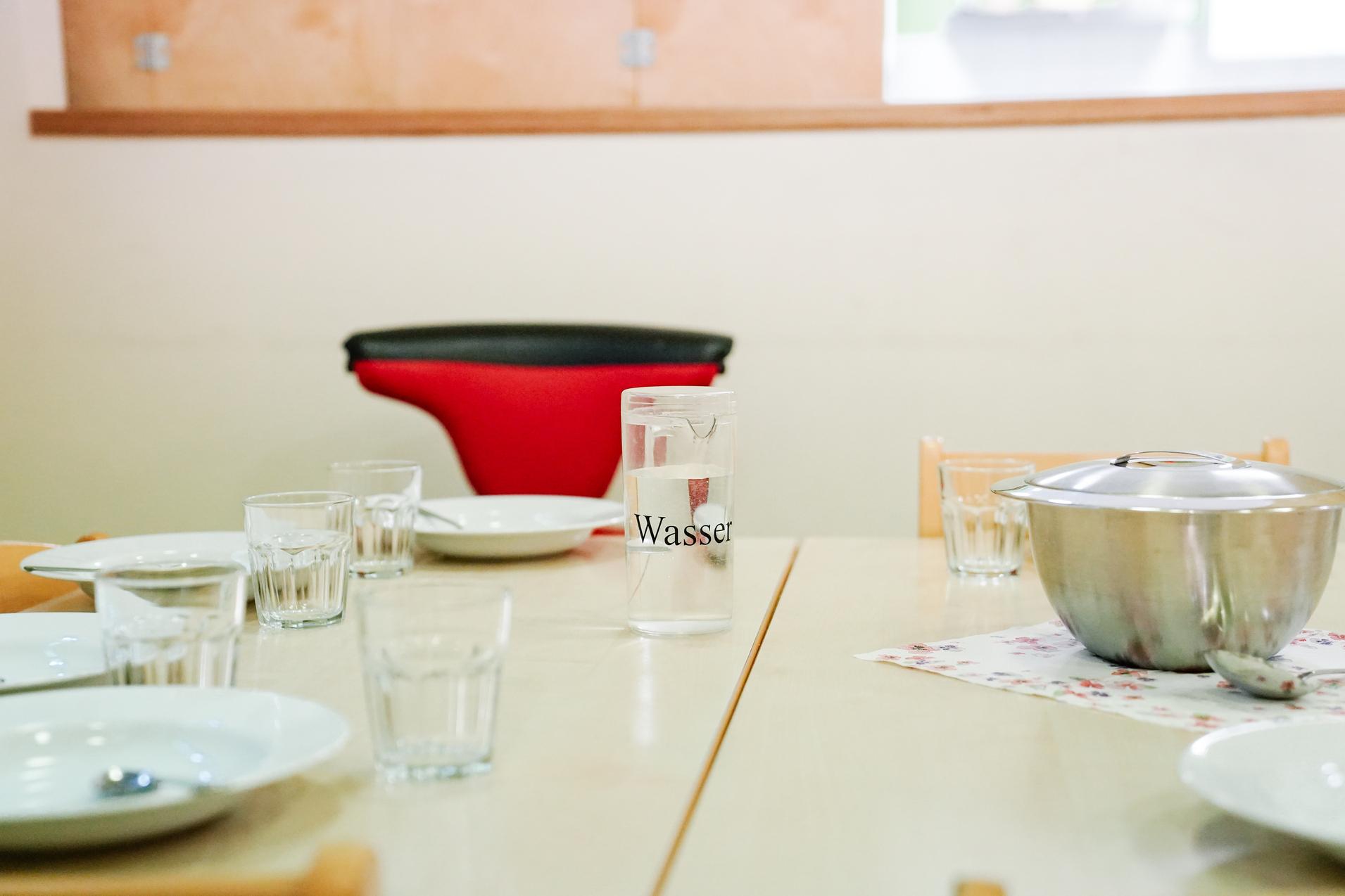 In der Kletteraffen- und Rennmausgruppe befindet sich eine Getränkebar, die zu jeder Zeit für die Kinder zur Verfügung steht. Die Kinder der Grashüpfergruppe bringen ihre eigene Trinkflasche mit in die Einrichtung.